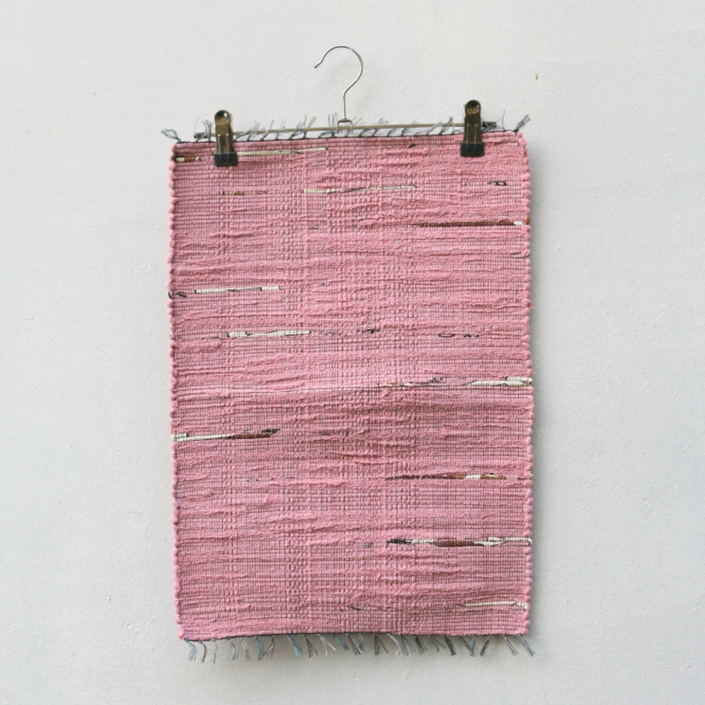 헌 티셔츠를 손베틀로 직조한 매트. 테이블 매트, 주방 매트, 도어 매트로 사용하기 좋은 사이즈.
