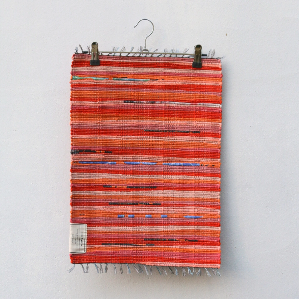 헌 티셔츠를 손베틀로 직조한 매트. 테이블 매트, 주방 매트, 도어 매트로 사용하기 좋은 사이즈.