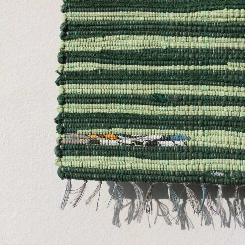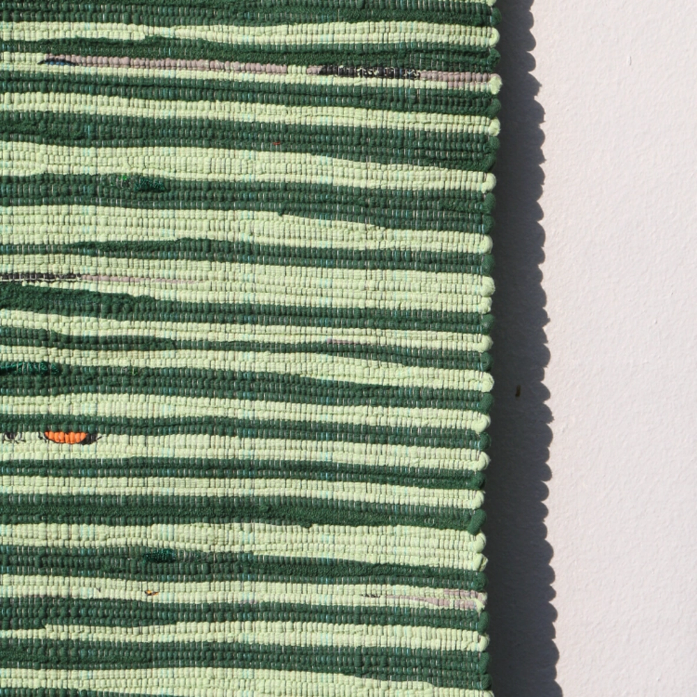 헌 티셔츠를 손베틀로 직조한 매트. 테이블 매트, 주방 매트, 도어 매트로 사용하기 좋은 사이즈.