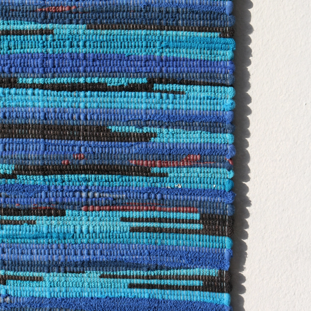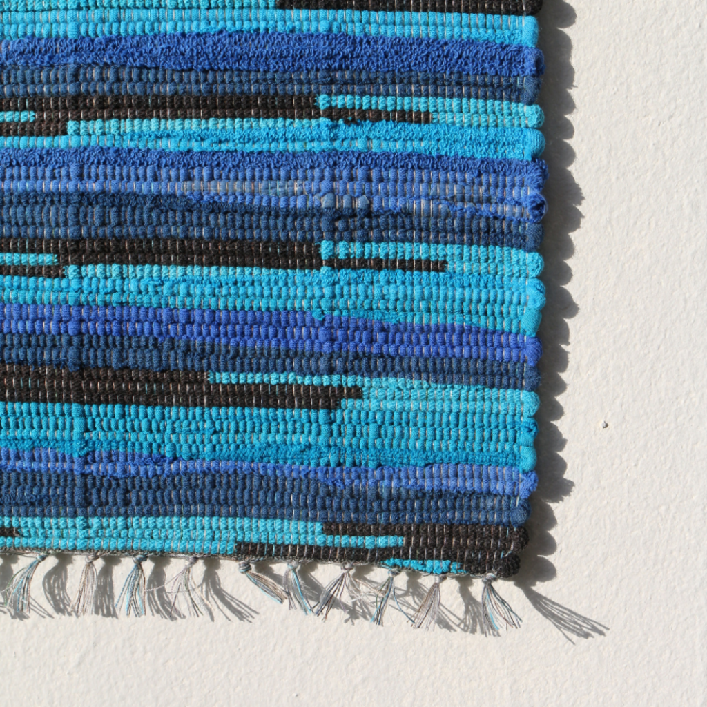 헌 티셔츠를 손베틀로 직조한 매트. 테이블 매트, 주방 매트, 도어 매트로 사용하기 좋은 사이즈.