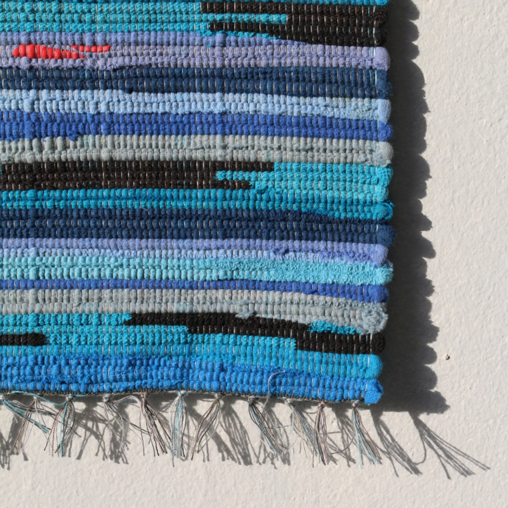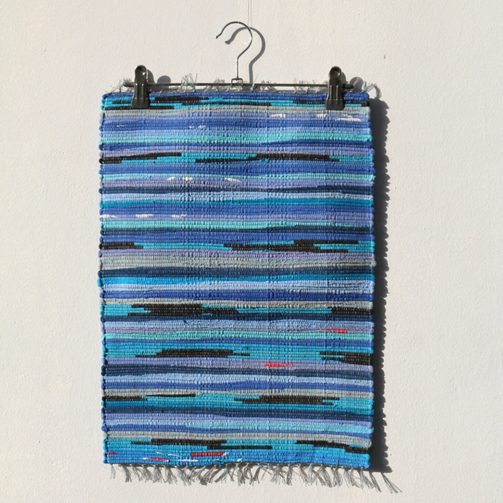 헌 티셔츠를 손베틀로 직조한 매트. 테이블 매트, 주방 매트, 도어 매트로 사용하기 좋은 사이즈.