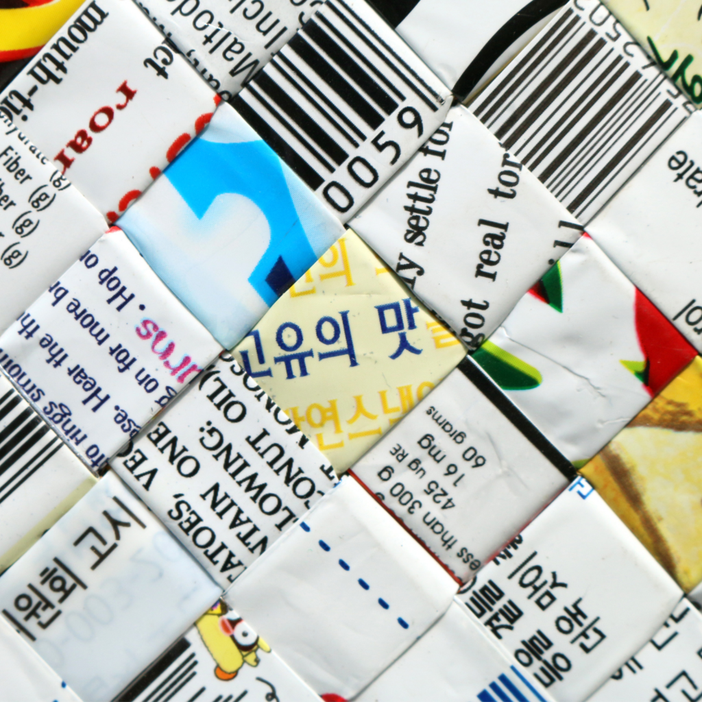 과자봉지, 라면봉지, 커피봉지 Snack, Ramen, Coffee wrappers.