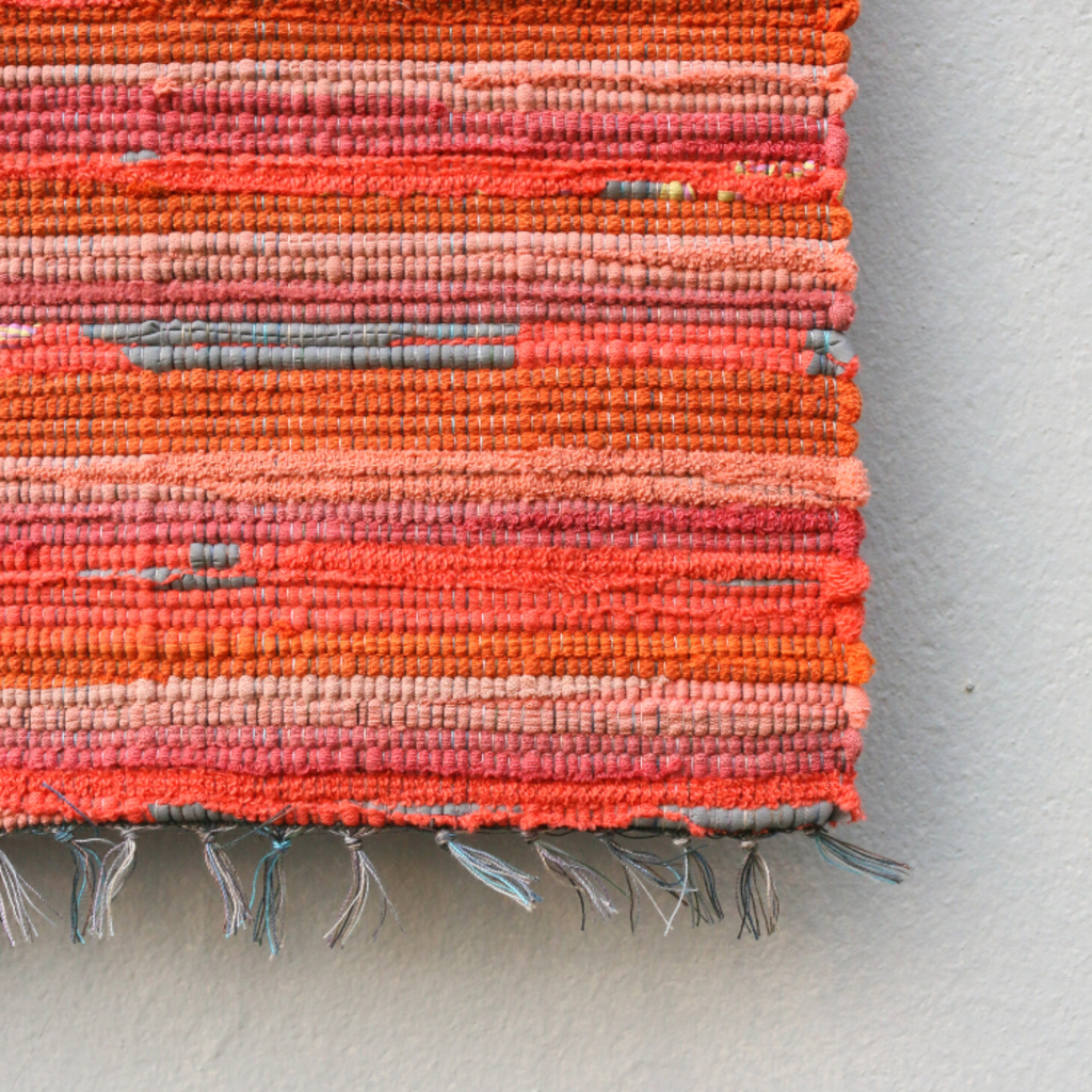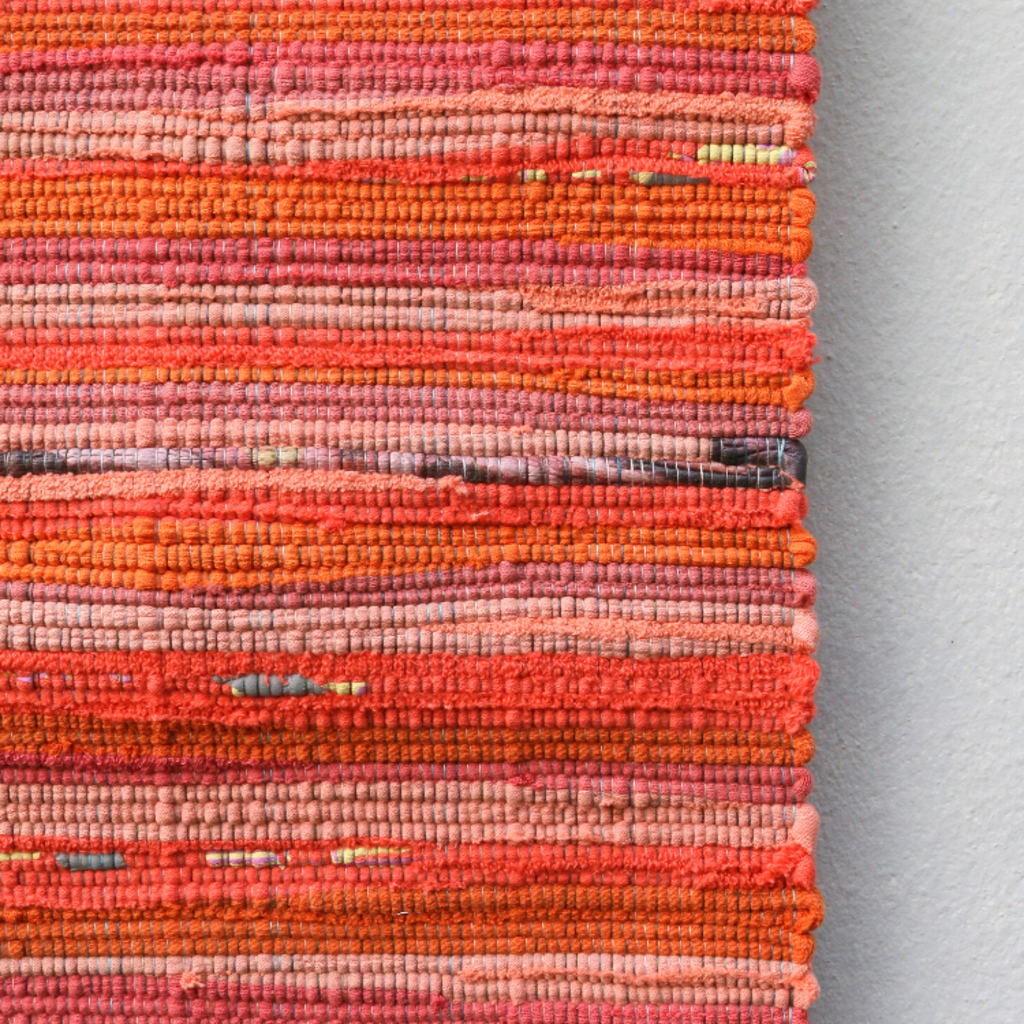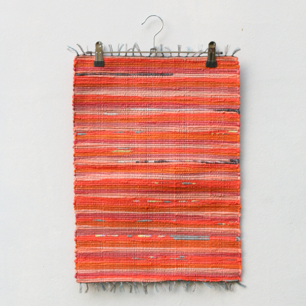 헌 티셔츠를 손베틀로 직조한 매트. 테이블 매트, 주방 매트, 도어 매트로 사용하기 좋은 사이즈.