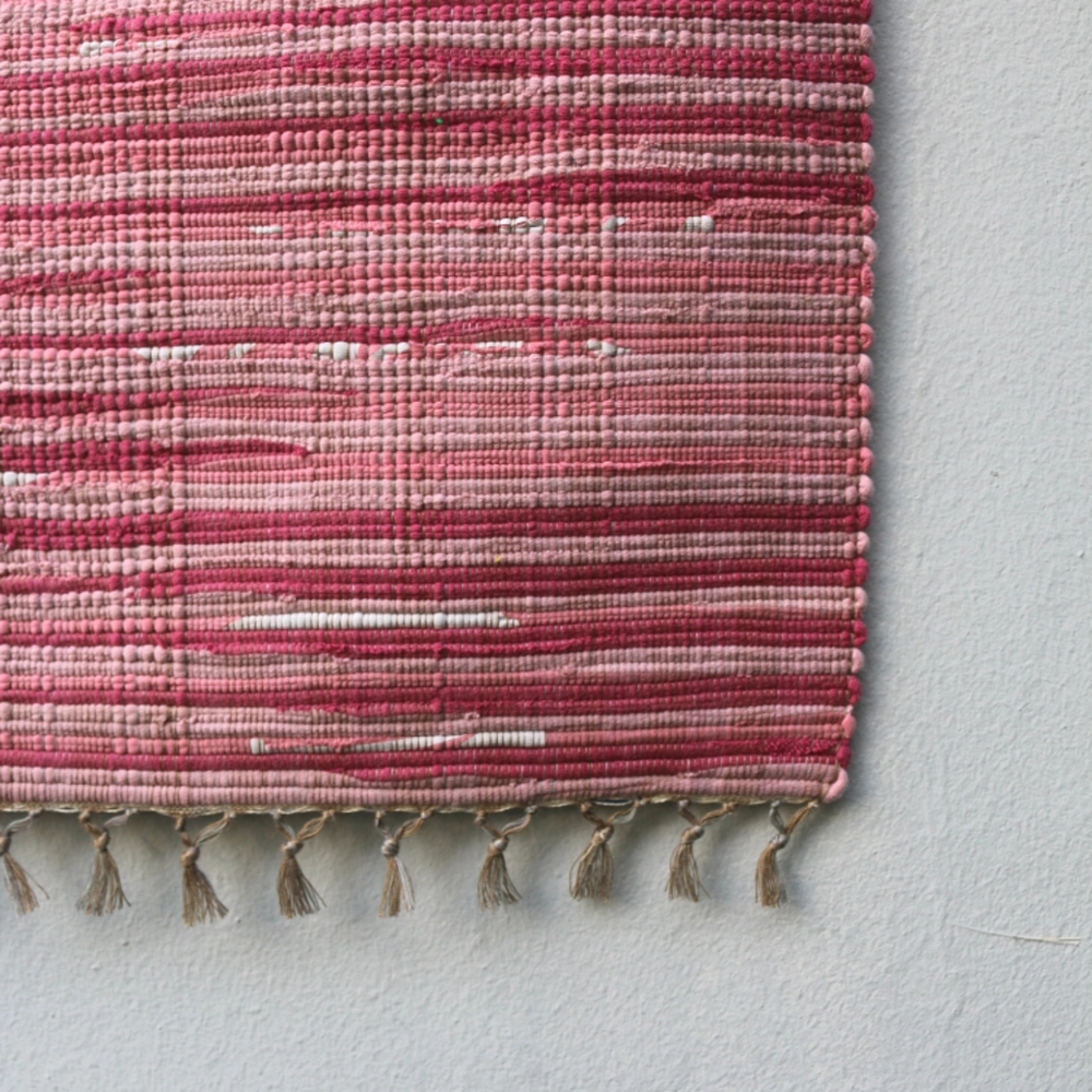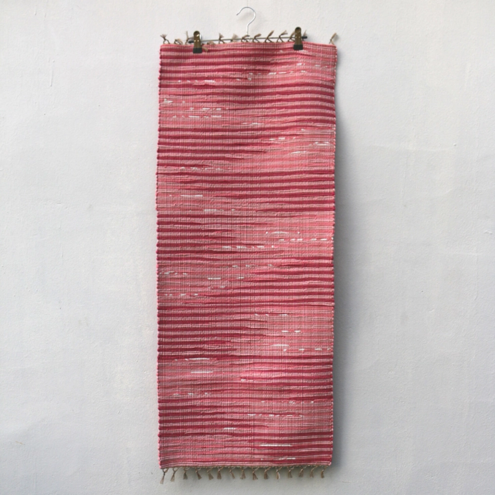 헌 티셔츠를 손베틀로 직조한 매트. 침대 밑 러그, 복도 러너등으로 사용하기 좋은 사이즈.