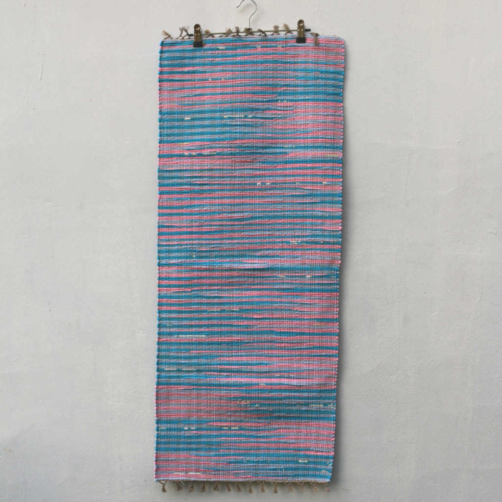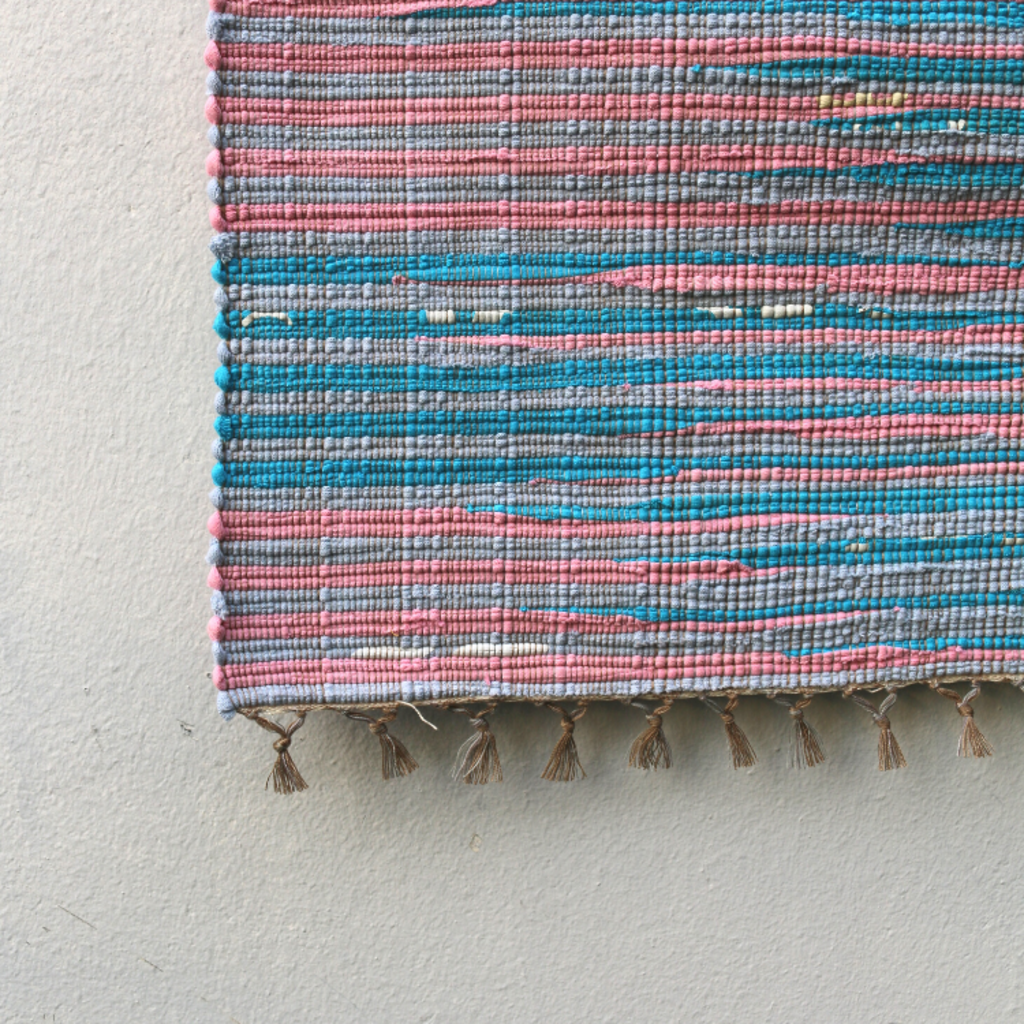 헌 티셔츠를 손베틀로 직조한 매트. 침대 밑 러그, 복도 러너등으로 사용하기 좋은 사이즈.