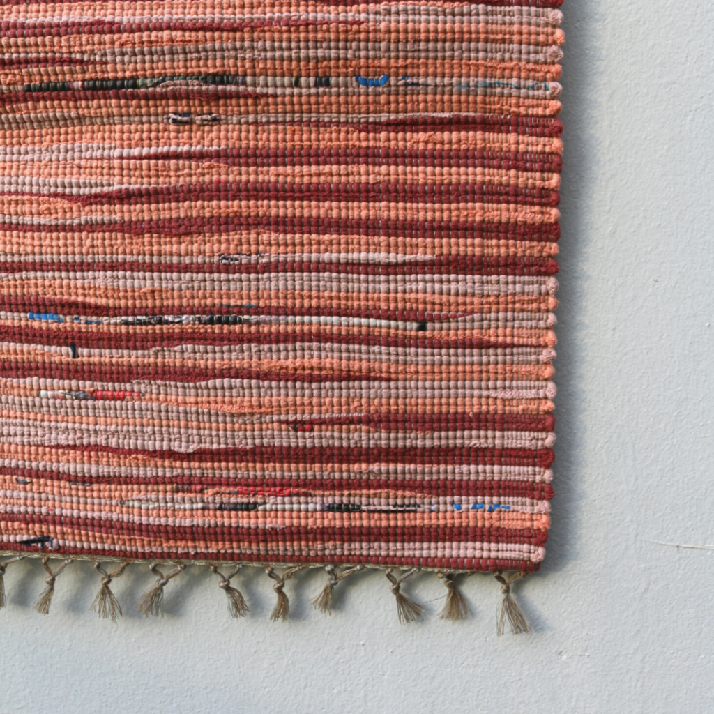 헌 티셔츠를 손베틀로 직조한 매트. 침대 밑 러그, 복도 러너등으로 사용하기 좋은 사이즈.