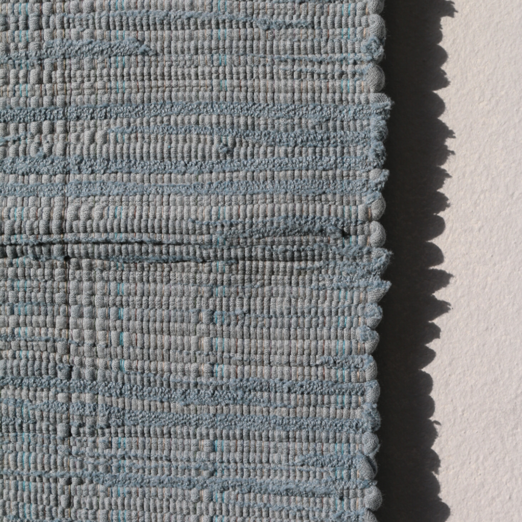 헌 티셔츠를 손베틀로 직조한 매트. 테이블 매트, 주방 매트, 도어 매트로 사용하기 좋은 사이즈.