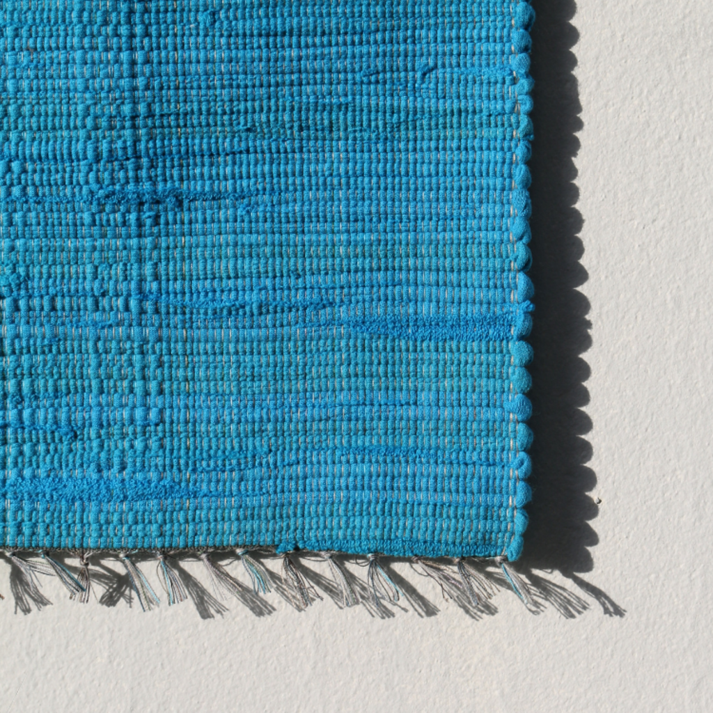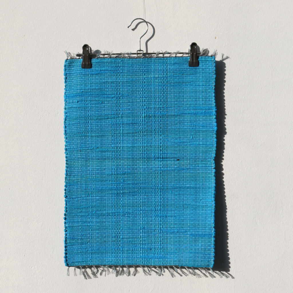 헌 티셔츠를 손베틀로 직조한 매트. 테이블 매트, 주방 매트, 도어 매트로 사용하기 좋은 사이즈.