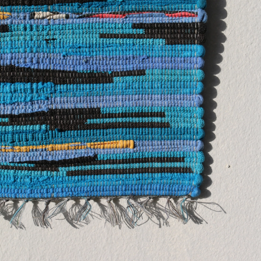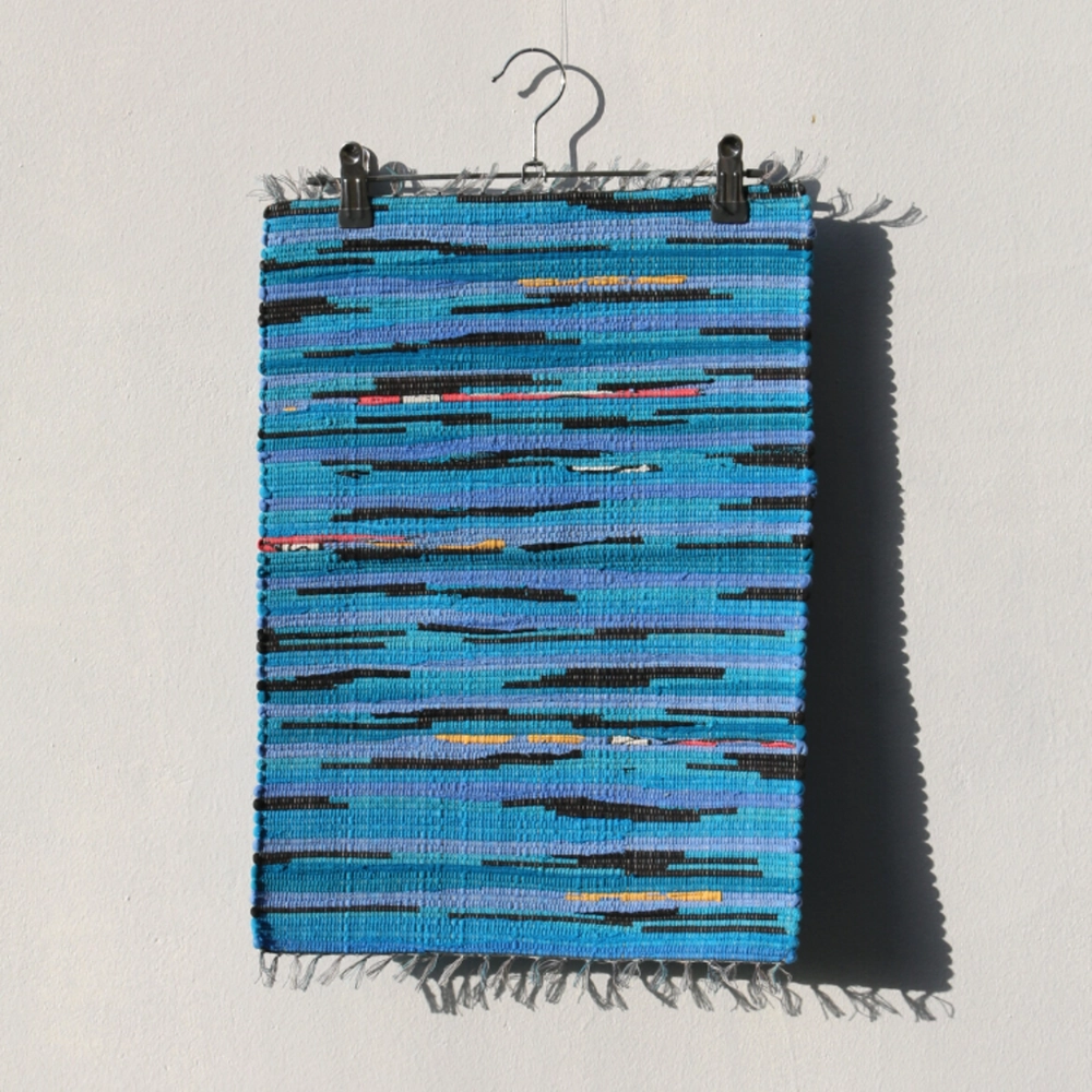 헌 티셔츠를 손베틀로 직조한 매트. 테이블 매트, 주방 매트, 도어 매트로 사용하기 좋은 사이즈.